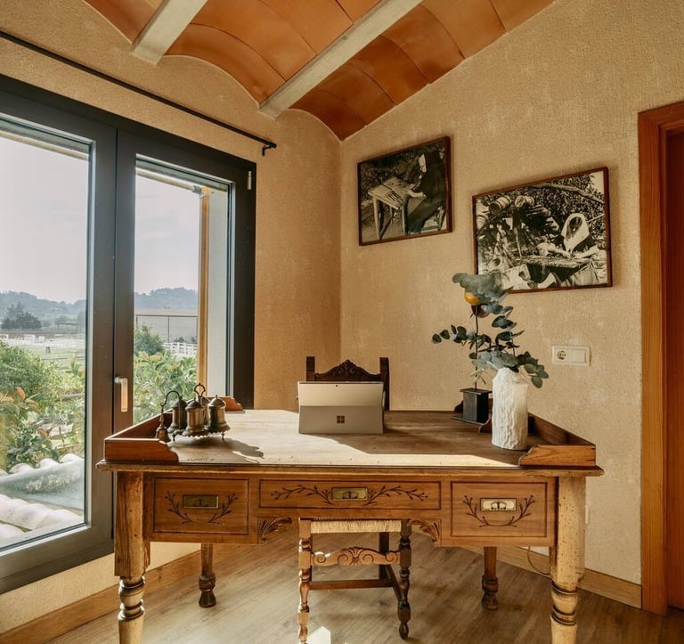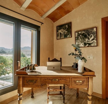 Trabajar o escribir aquí es hacerlo bajo la mirada de la historia. Las fotografías originales de los antiguos tejedores —los antepasados de esta casa— presiden este rincón, recordándonos la importancia del trabajo manual y las raíces de Selva. Un escritorio donde el silencio se llena de significado y la inspiración bebe directamente del origen.