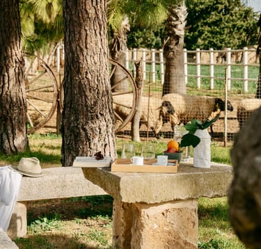 En Ca'n Frontera, la prisa no tiene cabida. Desayunar en esta mesa de piedra, entre antiguas ruedas de carro y con la compañía tranquila de las ovejas pastando a pocos metros, es un lujo olvidado. Aquí, el tiempo no se mide en horas, sino en la brisa que mueve los árboles y el pulso sereno de la naturaleza que te rodea.