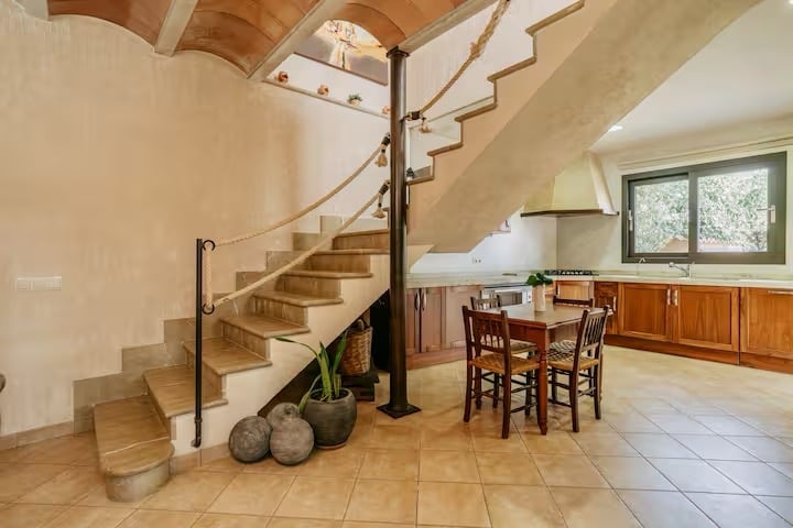 Una obra de arte esculpida en piedra de Binissalem que desafía la gravedad. Esta escalera no solo conecta dos plantas; une la tradición de la cantería mallorquina con un diseño aéreo que permite que la luz fluya sin barreras. Un "vuelo" de piedra natural sobre la cocina que te recuerda, en cada escalón, que estás habitando un espacio único.
